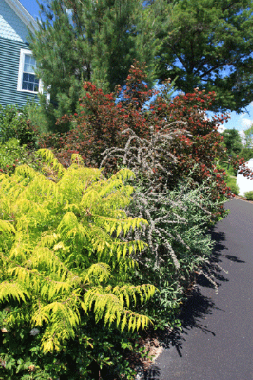 Rhus typhinia 'Tiger Eyes' with Butterfly Bush and Hawthorn