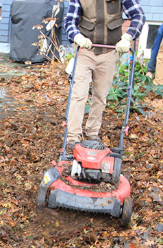 Remove fallen leaves from the lawn and garden beds. Rake them into loose piles and run the mower over them to turn them into mulch for shrub borders or perennial and bulb beds.