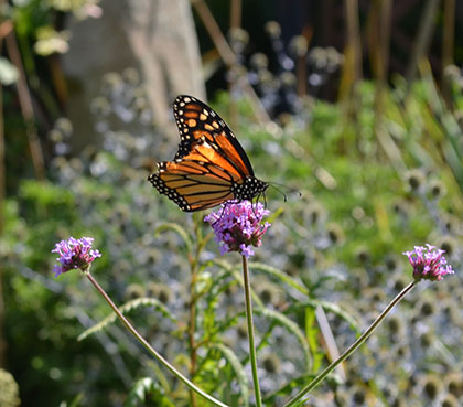 | This Monarch lost half its wing, likely in yesterday's storm. It is still flying and savoring the flowers. | The sunflowers along the driveway withstood the winds, and are still intact. The goldfinches will continue to enjoy the feast. |